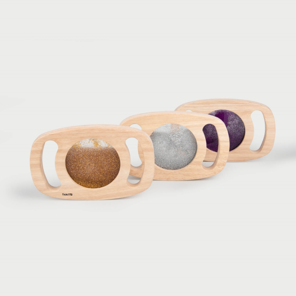 Dieses Set besteht aus drei Glitzertafeln mit einem stabilen Rahmen aus massivem Gummibaumholz und leicht zu haltenden Griffen. Jedes Paneel enthält eine funkelnde Glitzerflüssigkeit in seiner eigenen Farbe: Lila, Silber und Gold.