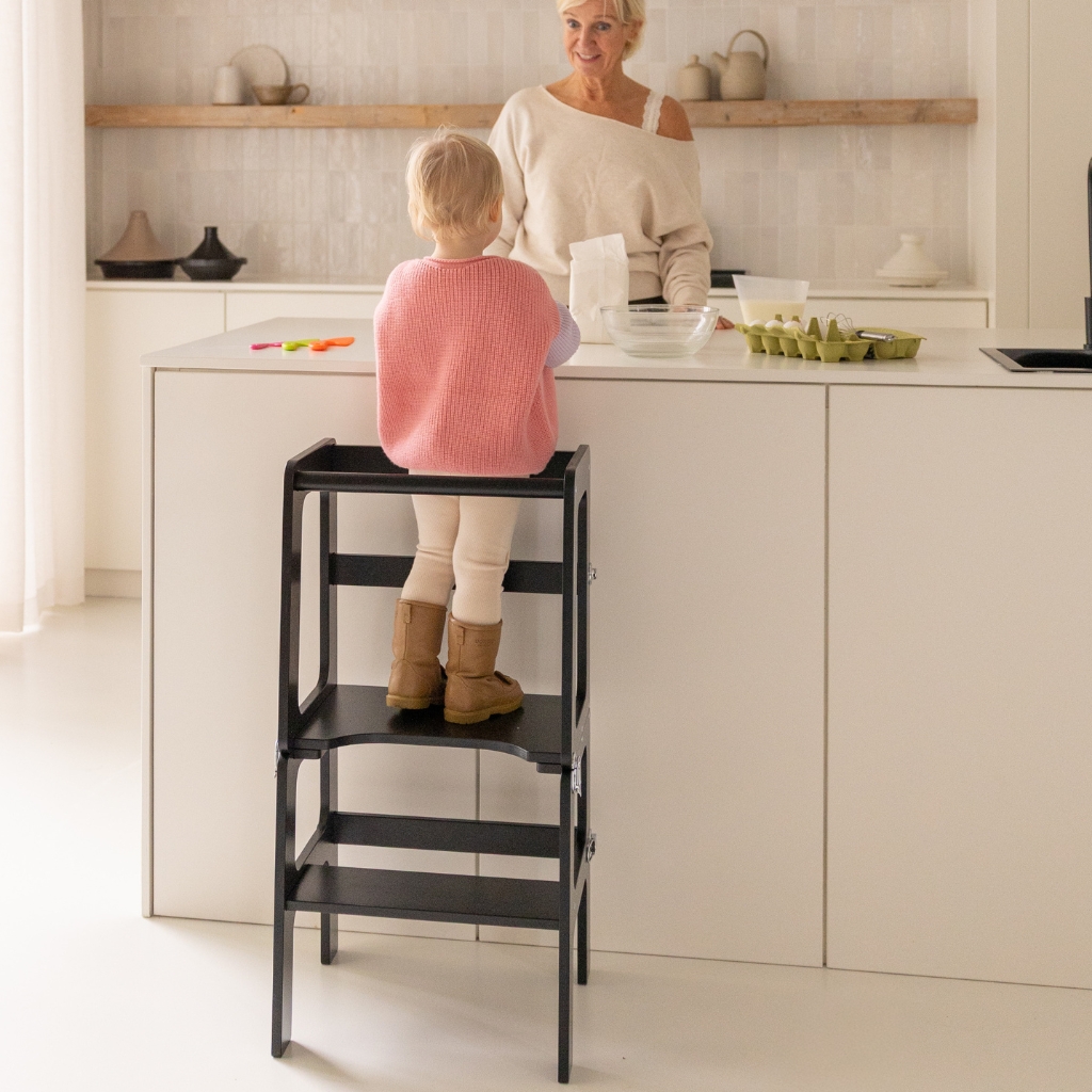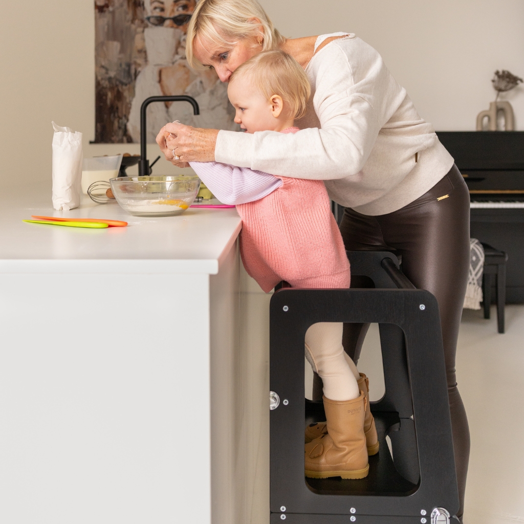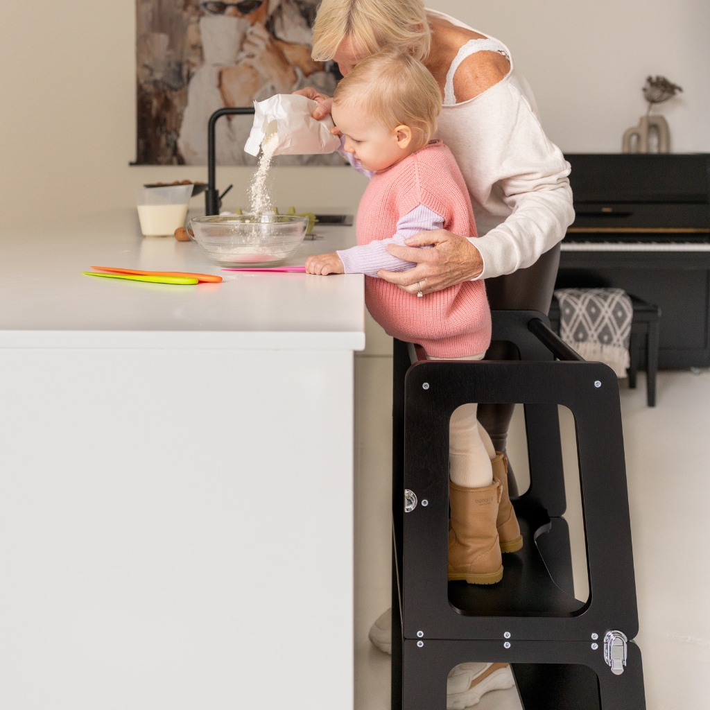 Neben dem einfachen Auf- und Absteigen bietet er auch genügend Platz zum Bewegen. So ist der Lernturm nicht nur eine Hilfe in der Küche, sondern Sie erhalten auch buchstäblich ein paar zusätzliche helfende Hände. Gemütlich, lehrreich und gut für die Entwicklung von Kindern. Mit diesem stilvollen schwarzen Lernturm kann das Kochen zu einer echten Qualitätszeit werden.