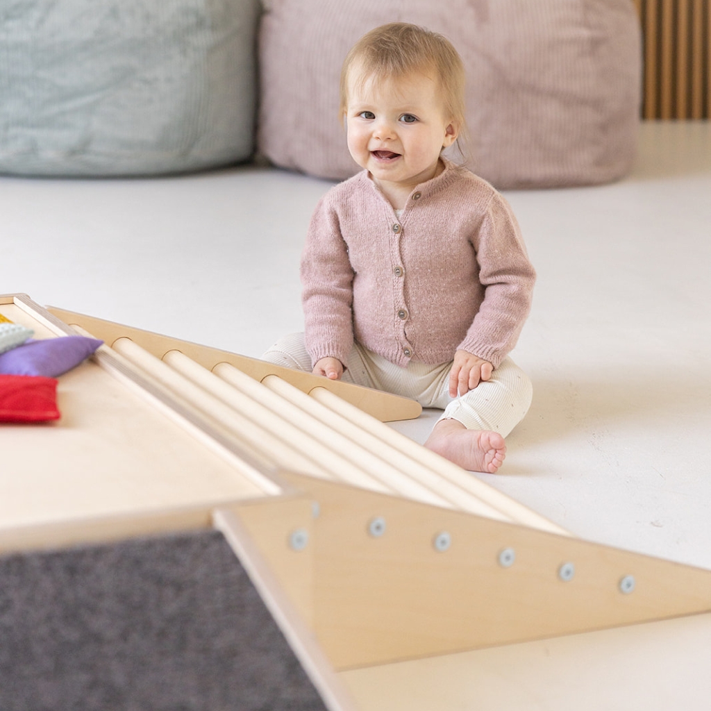 Der Krabbelhügel ist aus FSC-zertifiziertem Birkensperrholz für intensive Nutzung gefertigt. Die Holztreppe lässt sich leicht mit einem feuchten Tuch abwischen.
