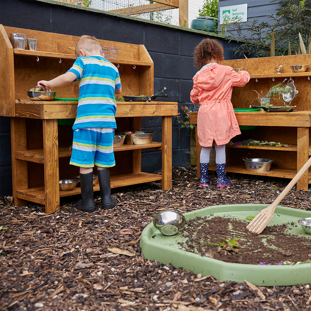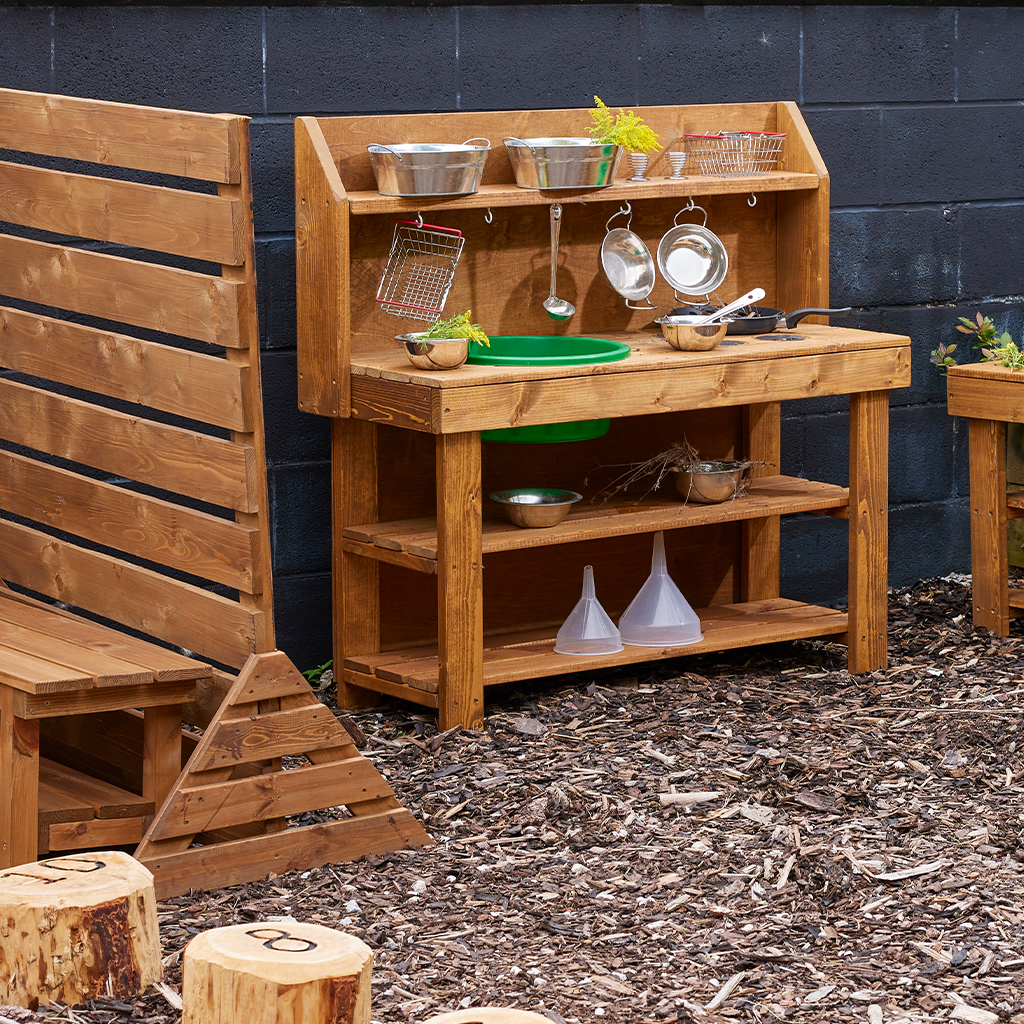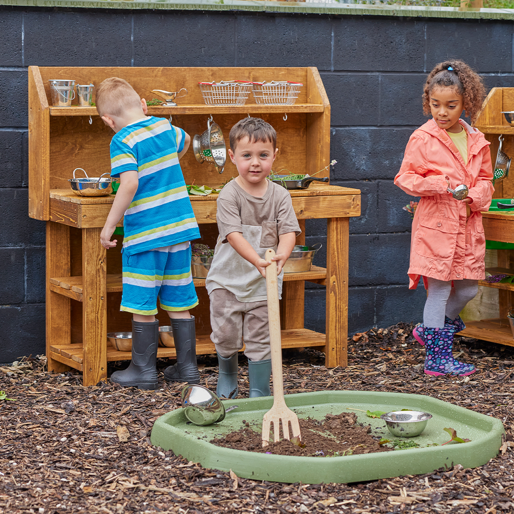 Mit dieser geräumigen Matschküche müssen Sie spielen. Sie können sie auf jedem Schulhof, in jedem Garten und auf jedem naturreichen Spielplatz genießen. Diese stabile Outdoor-Küche für Kinder verfügt über ein tiefes Waschbecken, eine kinderfreundliche Arbeitsplatte und viel Stauraum darunter. Das Regal ist außerdem sehr praktisch, um Töpfe und Pfannen darauf abzustellen. Damit ist die Matschküche ideal für Kinder, um sich mit Sand, Wasser und… Matsch auszutoben!