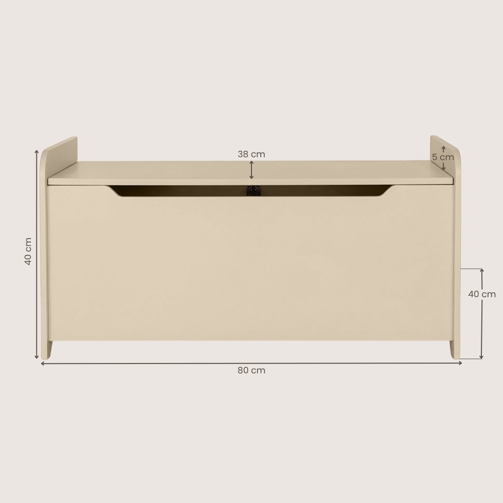 Diese hölzerne Spielzeugtruhe bietet eine Menge Stauraum. Seine Gesamtbreite beträgt 80 Zentimeter, während seine Tiefe 40 Zentimeter beträgt. Die Ablagefläche ist nicht weniger als 30 Zentimeter hoch. Sie können Ihre Sachen also ganz einfach dort hineinlegen. Wenn Sie die Klappe vollständig öffnen, beträgt die Höhe 71,5 Zentimeter. Praktisch zu wissen, wenn die Spielzeugtruhe zum Beispiel unter ein höheres Bett gestellt werden soll.