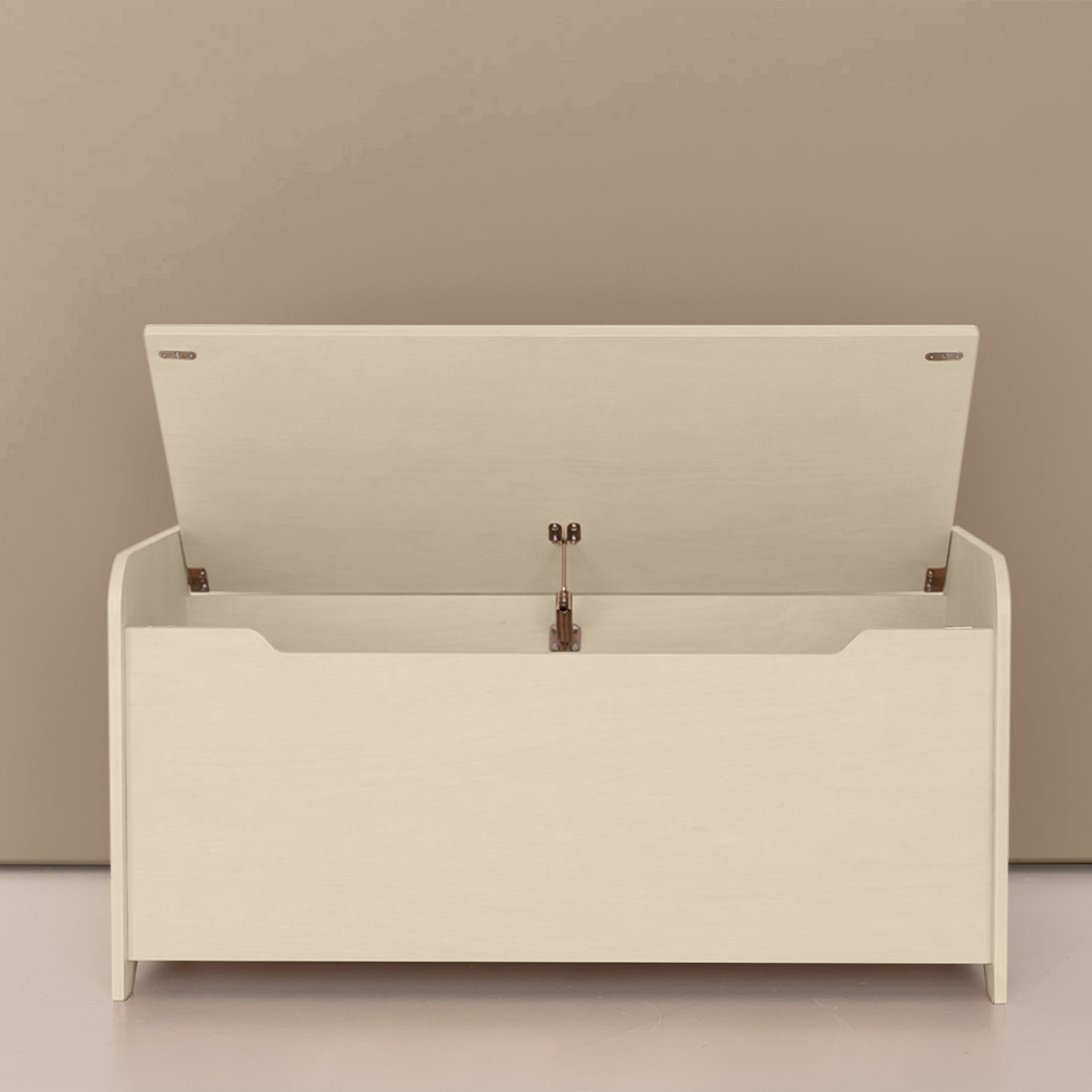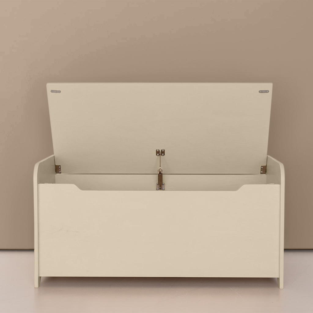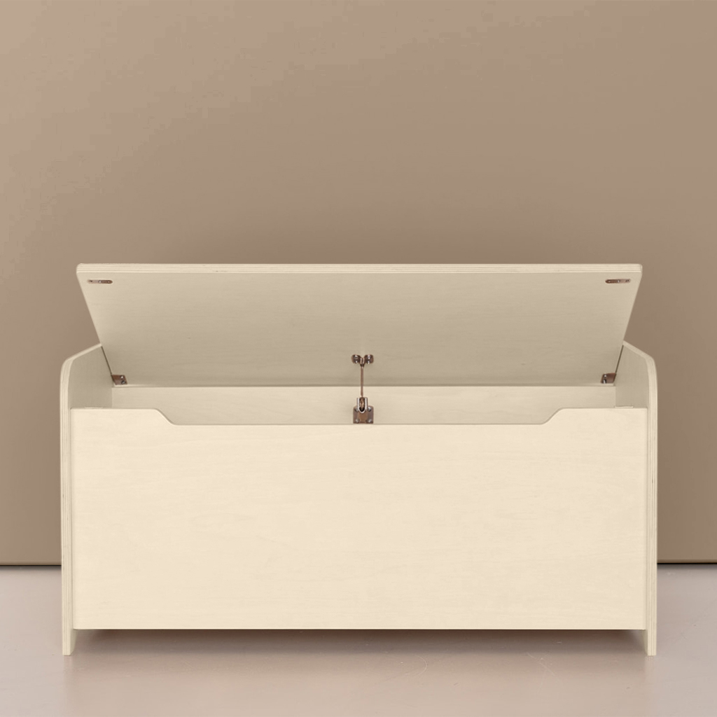 Die Spielzeugkiste hat eine praktische Aussparung an der Vorderseite. Das sieht nicht nur gut aus, sondern ist auch besonders sicher. Dadurch wird verhindert, dass kleine Hände schnell zwischen Deckel und Vorderseite geraten. Außerdem ist es einfacher, den Deckel zu öffnen, und er lässt sich von Haus aus nicht luftdicht verschließen.