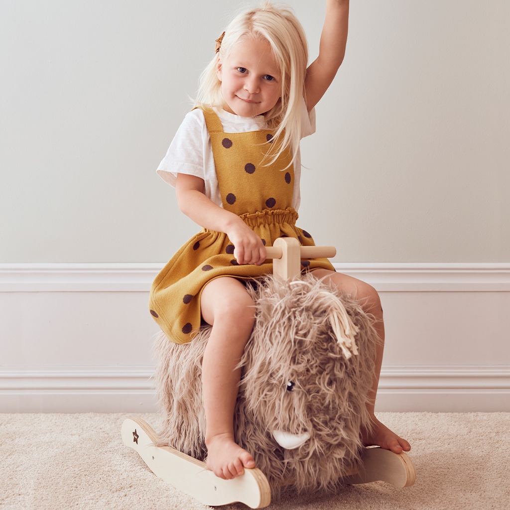 Die schönen neutralen Farben machen dieses Spielzeug auch bei den Eltern sehr beliebt. In einem Baby- oder Kinderzimmer sieht es einfach herzlich aus. Übrigens… im Wohnzimmer ist dieses freundliche Schaukeltier ebenfalls ein gern gesehener Gast.