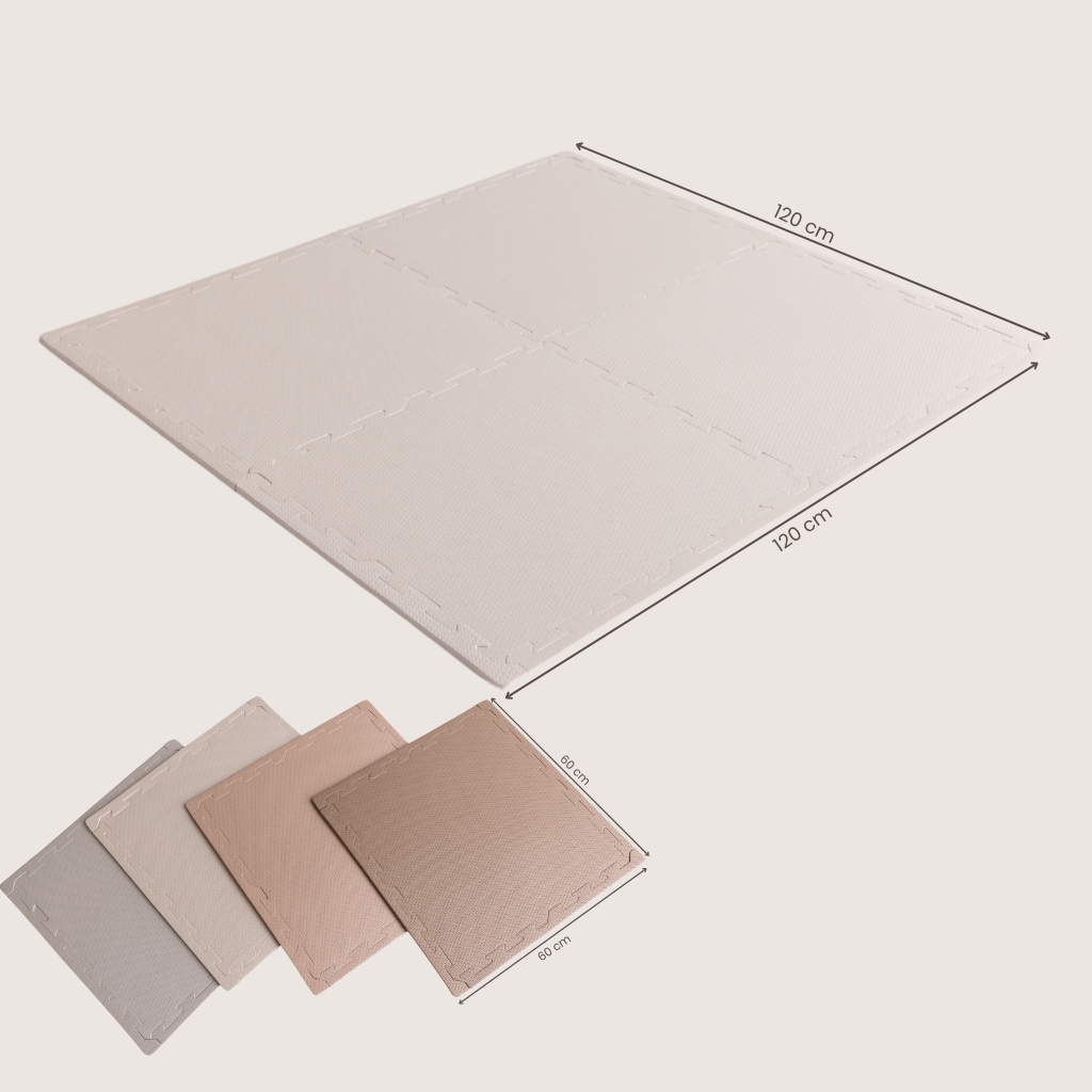 Satz von 4 beigen Puzzlematten mit den Maßen 60×60 Zentimetern. Zusammengesetzt ergibt sich eine bequeme quadratische Spielmatte von 1,20 x 1,20. Die Dicke der Matten beträgt 1,2 Zentimeter, so dass Kinder und Erwachsene auf ihnen spielen oder z.B. Sport treiben können.