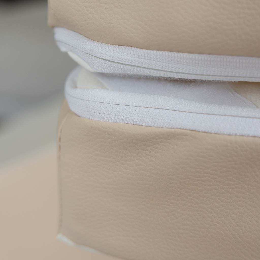 Die Schaumstoffsets sind aus T-21 Schaumstoff hergestellt. Dieser Schaumstoff wird auch für Möbel verwendet und ist besonders fest. Dank der PVC-Kunstlederpolsterung der Spielsets lassen sie sich leicht mit einem feuchten Tuch reinigen. Die Reißverschlüsse an den Bezügen befinden sich auf der Innenseite, so dass Kinder die Bezüge nicht einfach vom Spielset abziehen können und sich vor allem nicht an den Reißverschlüssen verletzen können. Die verschiedenen Teile der Spielsets werden mit Klettverschluss aneinander befestigt. Der Klettverschluss an diesen Spielgeräten wird vom Stoff überlappt. Das macht ihn besonders stabil, wenn Kinder darauf laufen und verhindert, dass sie zwischen die beiden Teile geraten. Dies ist in der nachstehenden Abbildung deutlich zu erkennen.