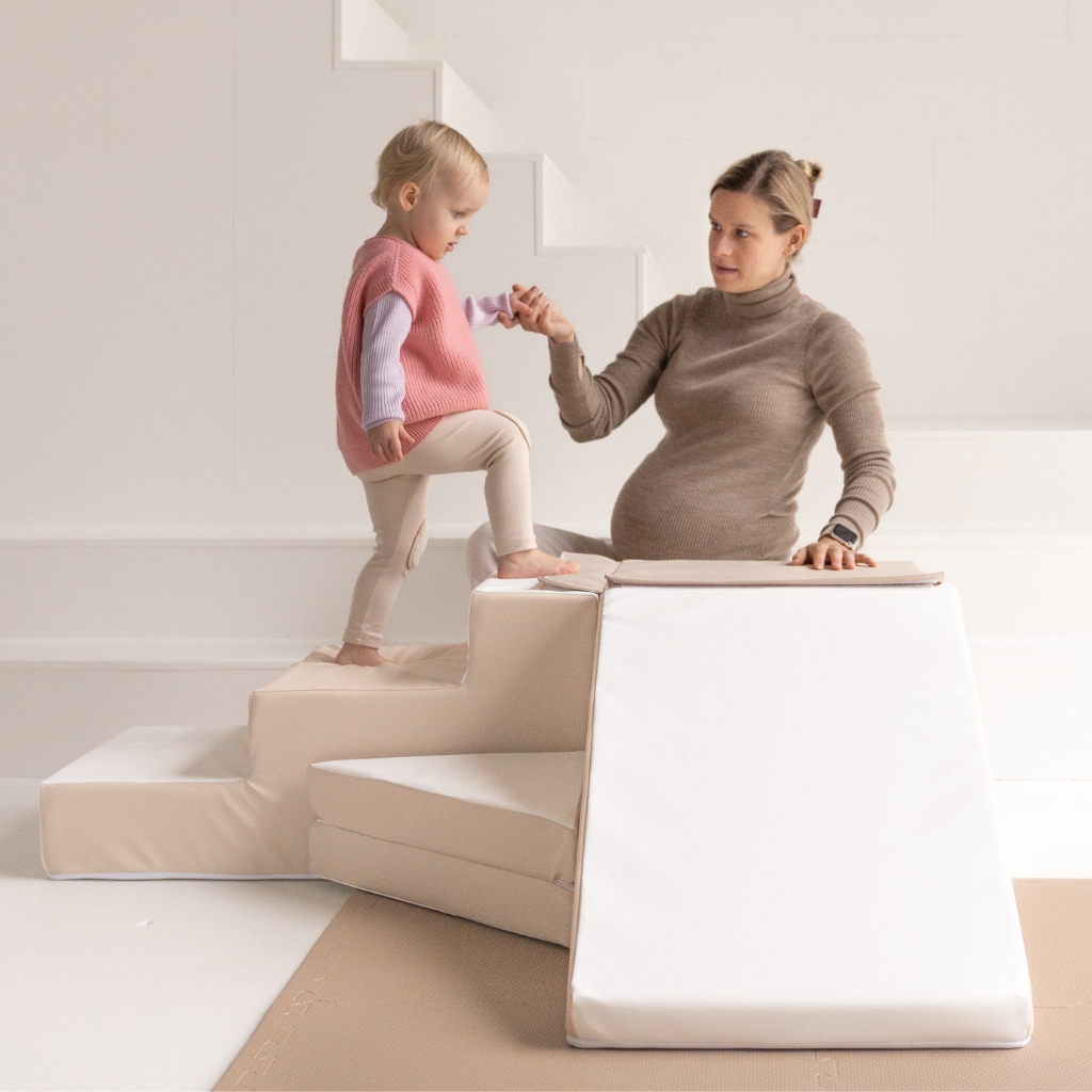 Schönes Spielset aus Schaumstoff in weiß mit beige. Mit diesem lustigen Set können Sie klettern und rutschen. Dies ist auch eine perfekte Möglichkeit, Ihrem Kind beizubringen, selbstständig die Treppe hinunter und hinauf zu gehen. Alle 4 Elemente sind weich, sicher und toll zum Spielen. Der Innenschaum ist von hoher Qualität und Elastizität, um Beulen zu vermeiden. Die erhöhte Dichte des Schaumstoffs macht das Spielen noch sicherer und verbessert die Effizienz der Übungen. Spaß zu spielen und auch gut für die Entwicklung.