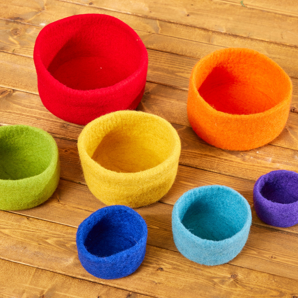 Regenbogentabletts aus Filz in fröhlichen, warmen Regenbogentönen. Die Tabletts können ineinander gestellt werden und sind ideal, um kleine Materialien zu sammeln oder Spielzeug nach Farben zu sortieren.