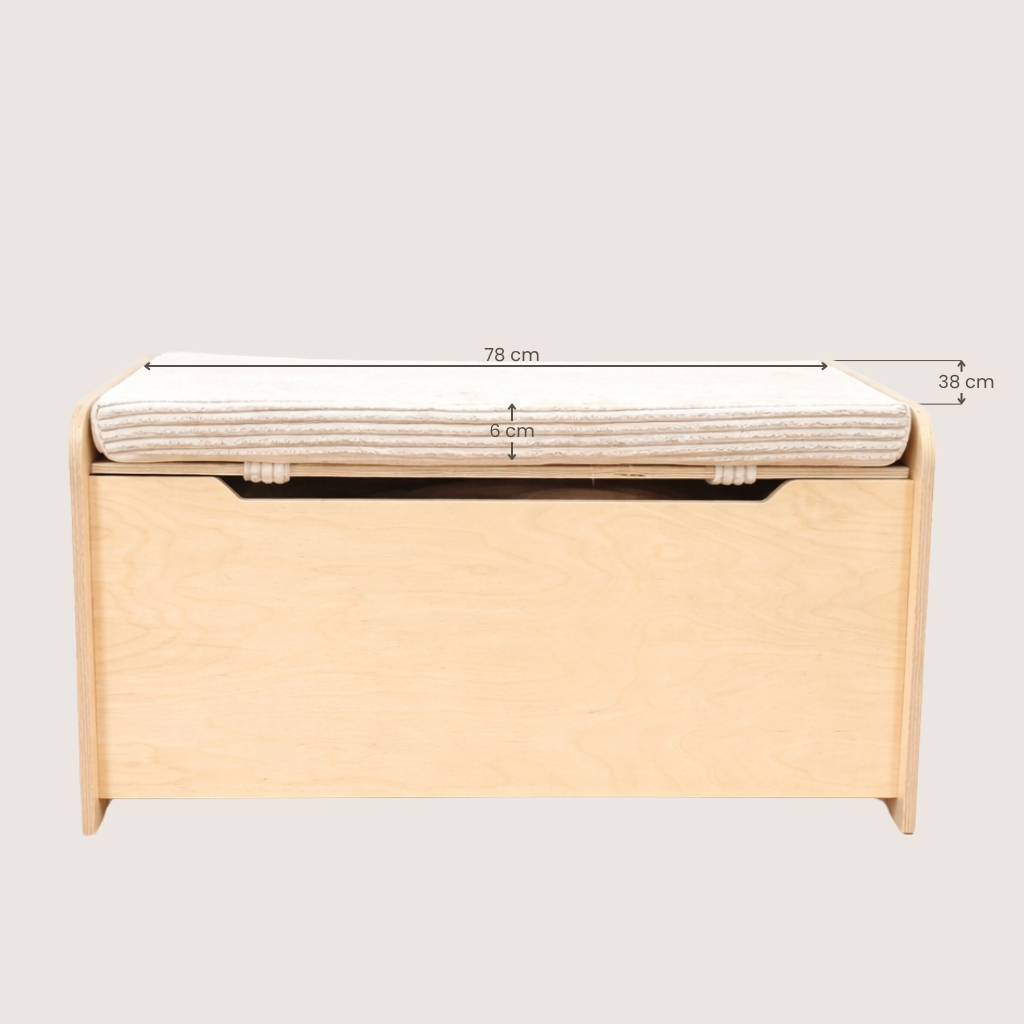 Unsere Spielzeugtruhe wurde entworfen, um Ruhe in Ihr Zuhause zu bringen. Mit diesem Sitzkissen fügen Sie eine weitere Funktion hinzu: einen schönen Platz zum Sitzen: