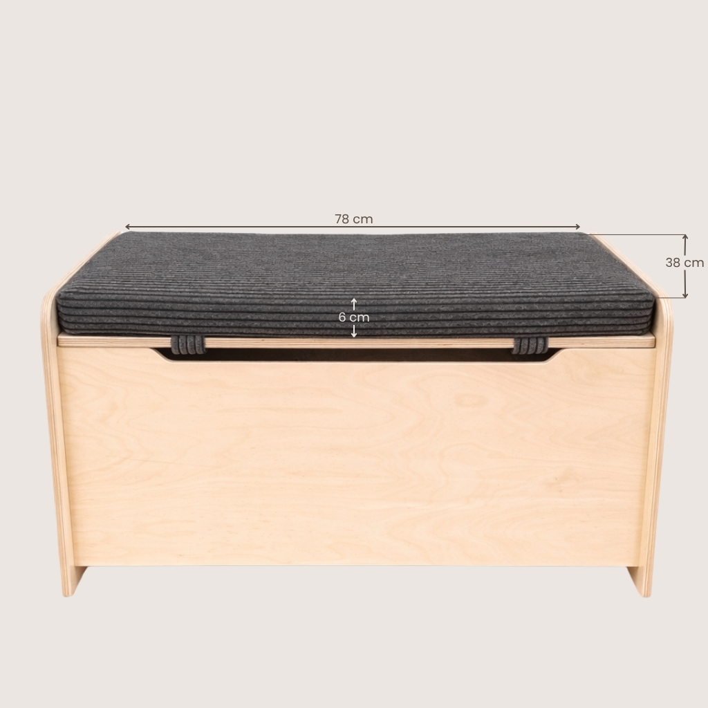 Unsere Spielzeugtruhe wurde entworfen, um Ruhe in Ihr Zuhause zu bringen. Mit diesem Sitzkissen fügen Sie eine weitere Funktion hinzu: einen schönen Platz zum Sitzen: