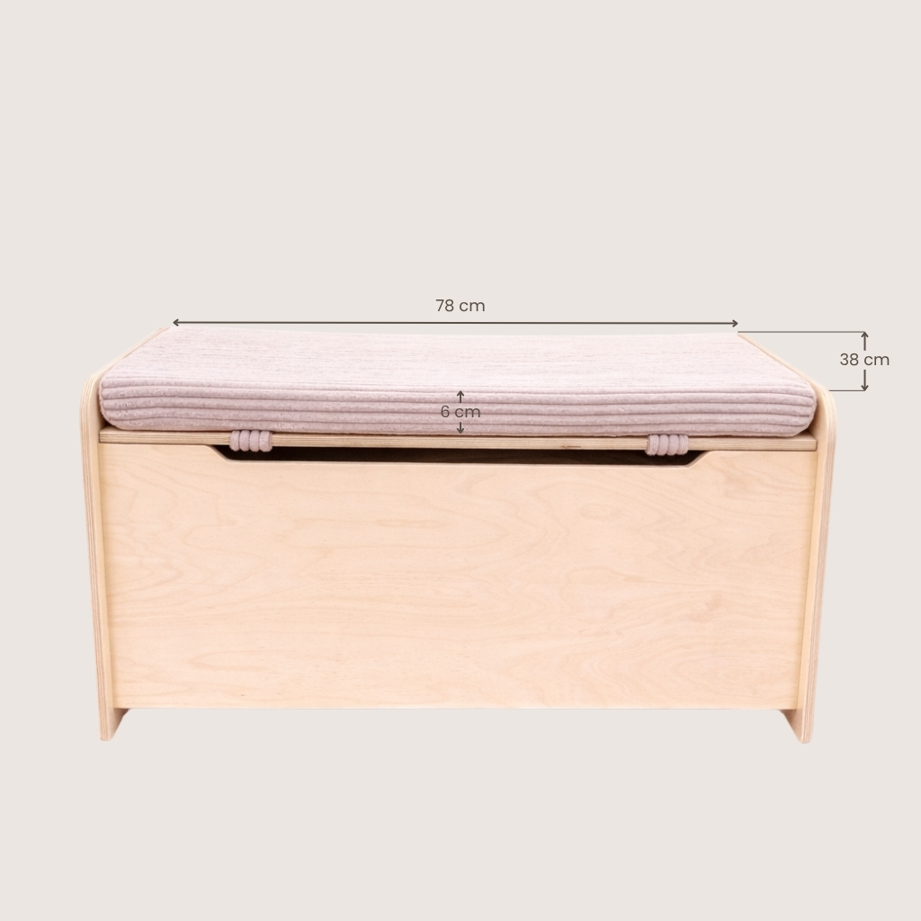 Unsere Spielzeugtruhe wurde entworfen, um Ruhe in Ihr Zuhause zu bringen. Mit diesem Sitzkissen fügen Sie eine weitere Funktion hinzu: einen schönen Platz zum Sitzen: